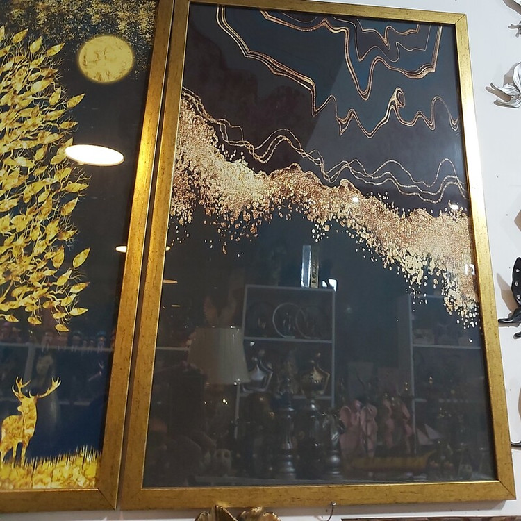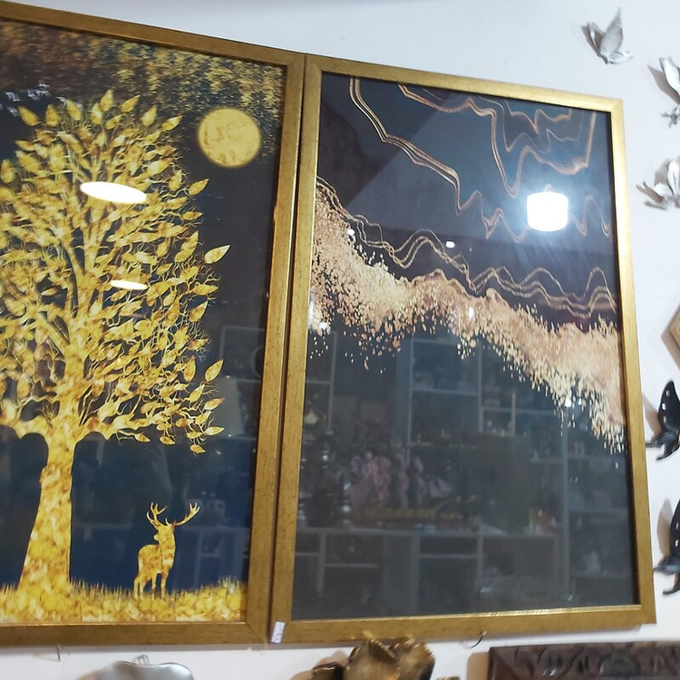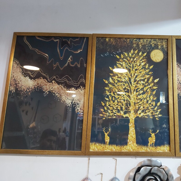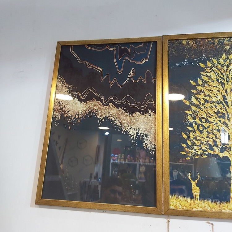 سه تیکه با هم ابعاد 50 × 70 سانت جنس شیشه و رزین رنگ طلایی ورق طلا طرح گوزن و درخت