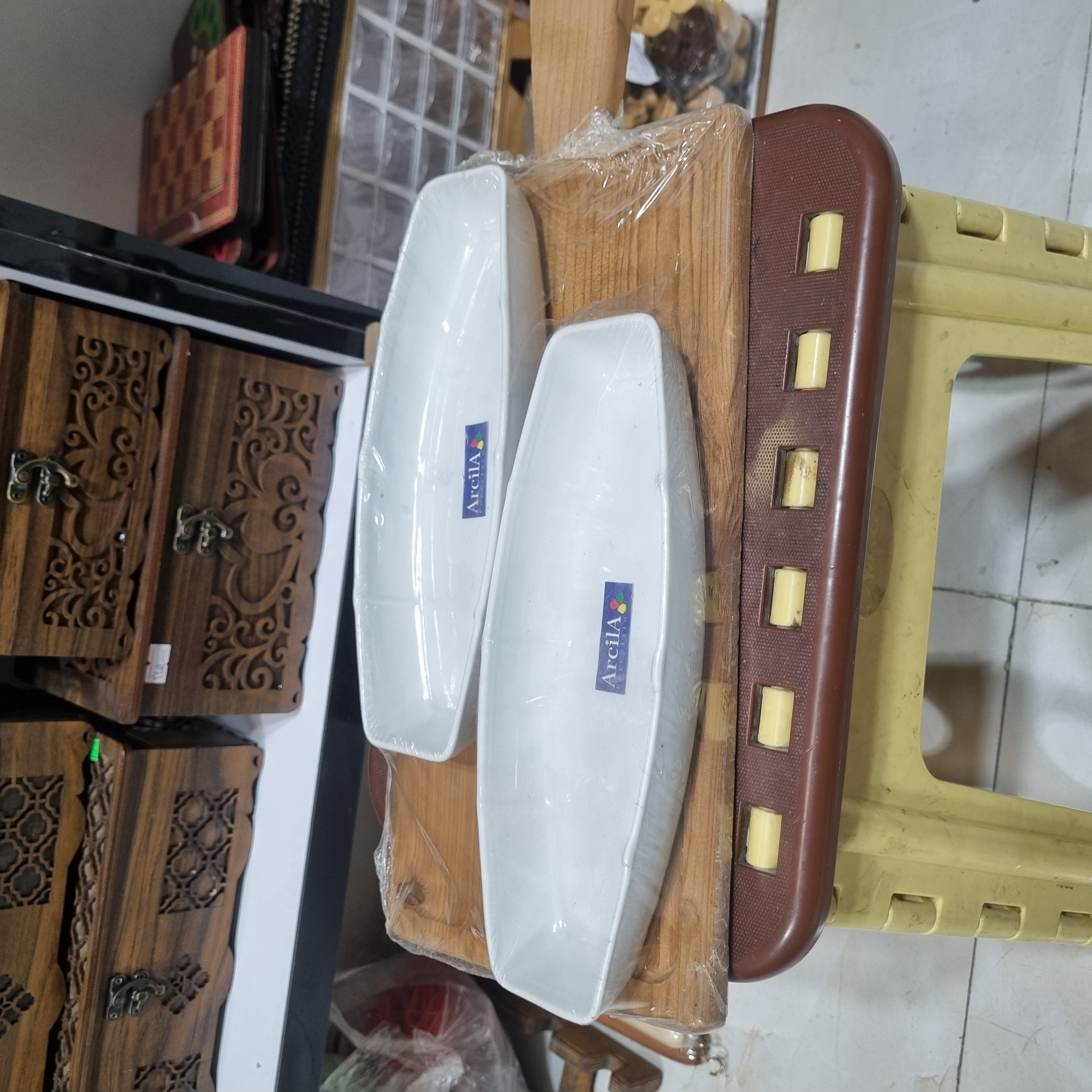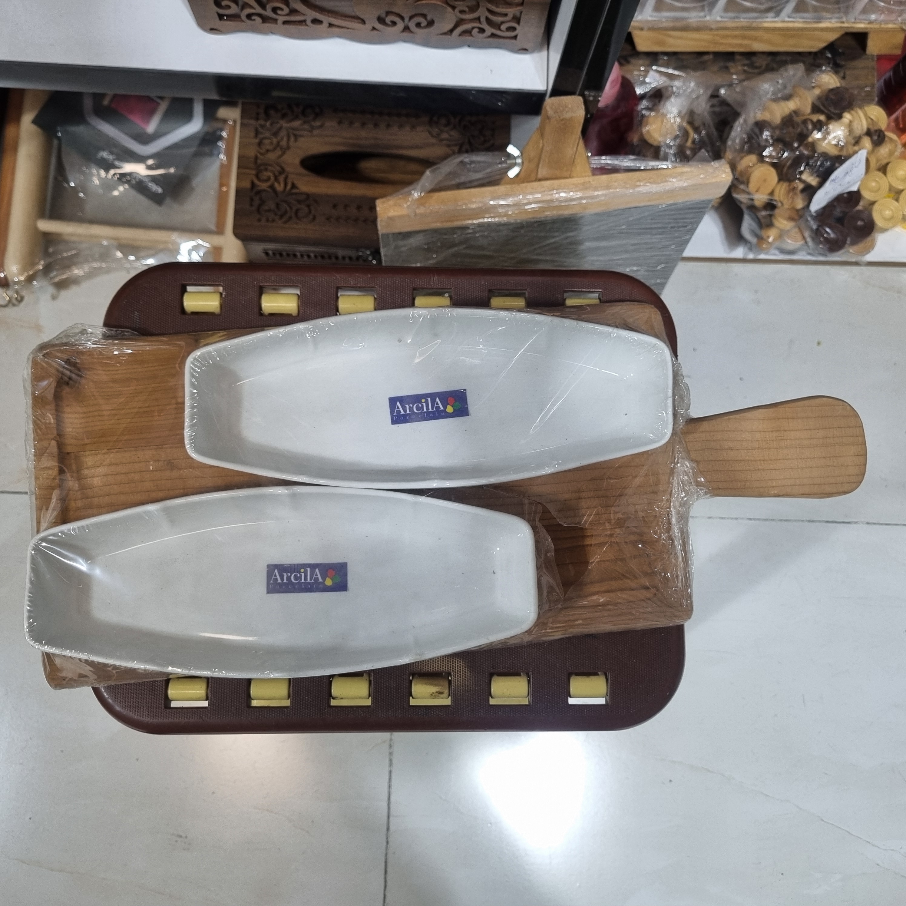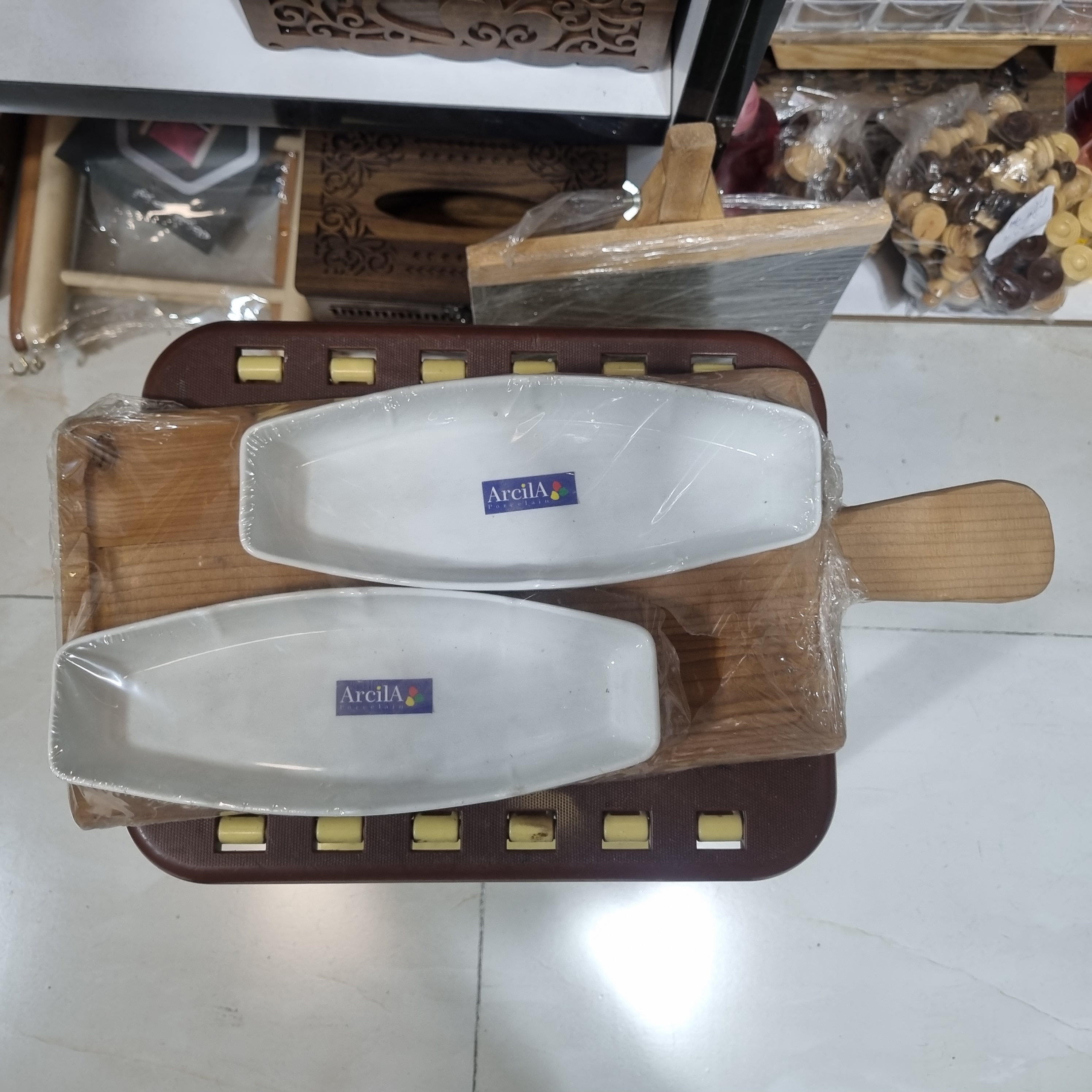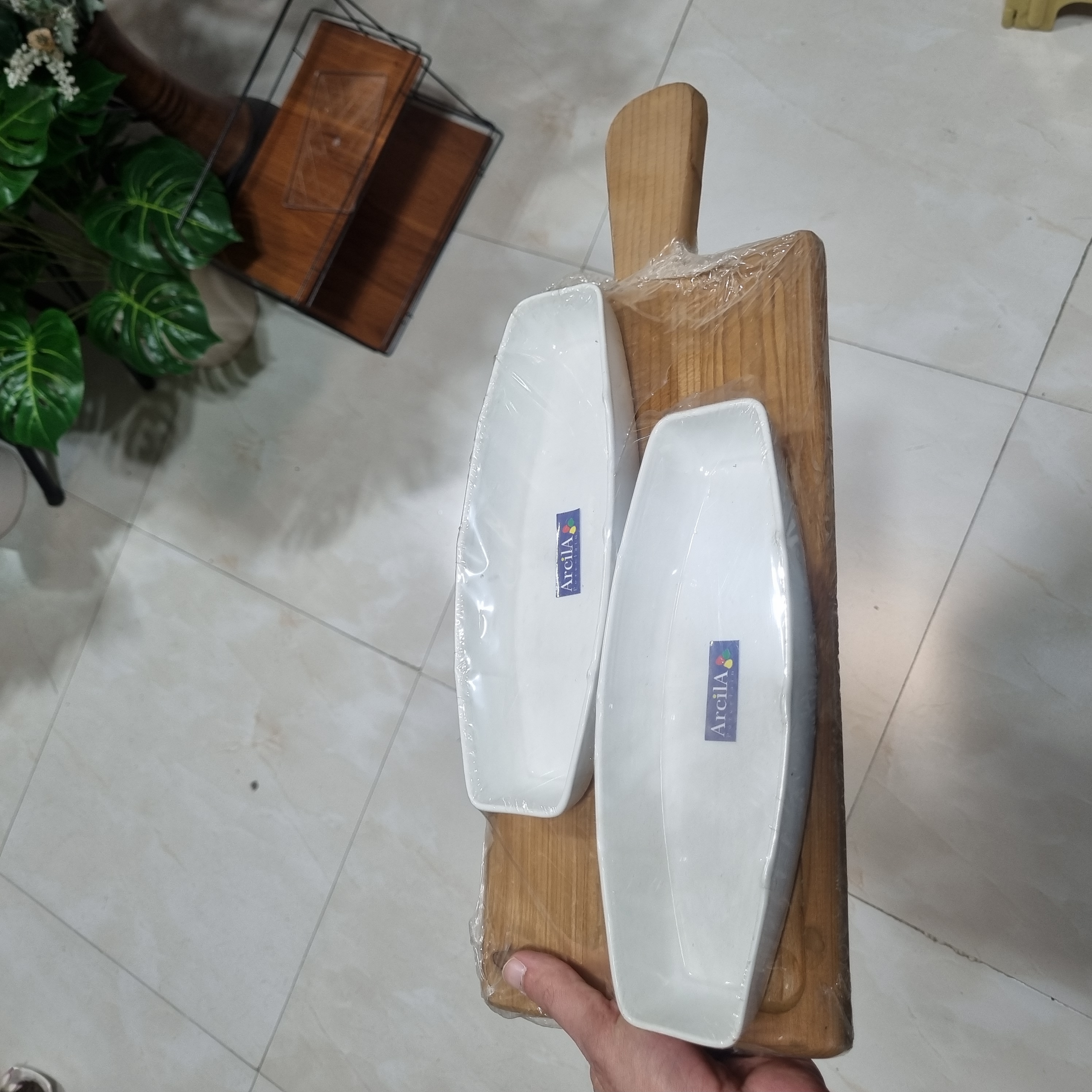 ابعاد تقریبی ۲۰×۴۰ سانتیمتر، متریال سرامیک و چوب، رنگ سفید با پایه چوبی طبیعی، مناسب سرو و دکور، برند Arcila (آرکیلا)، کد محصول CN1010.