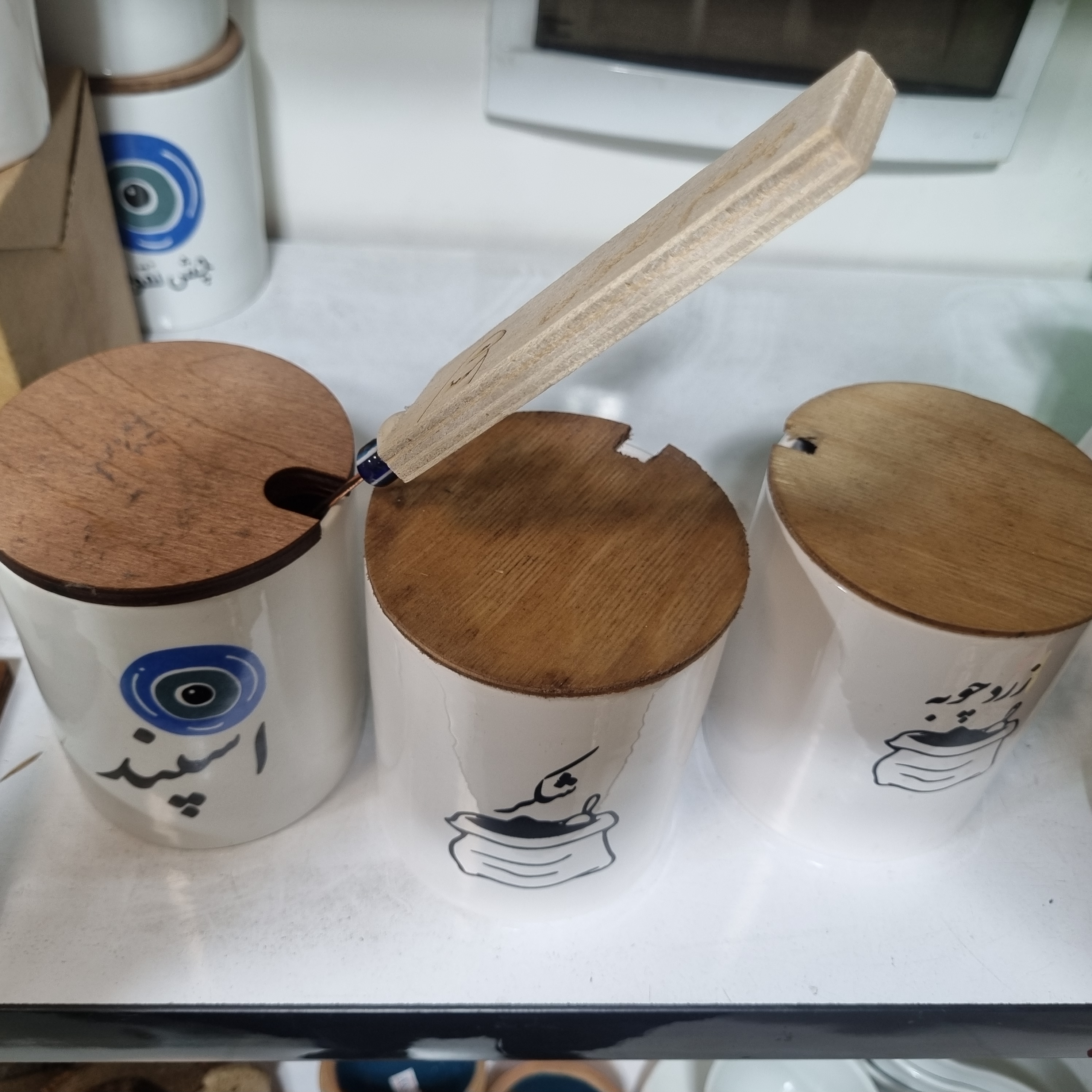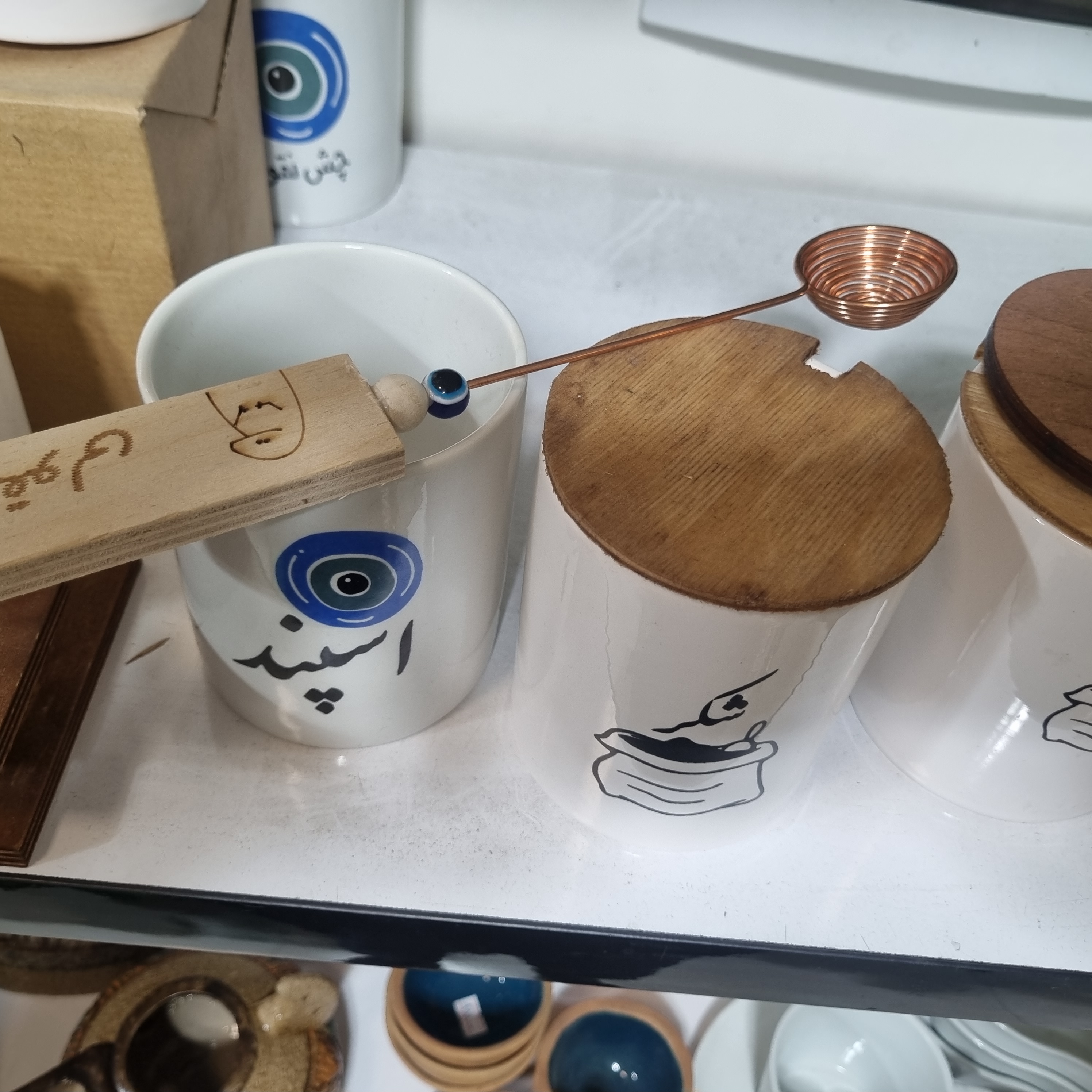 ابعاد هر ظرف حدود ۱۵×۸ سانتیمتر، جنس سرامیک با درب چوبی، شامل چند پاسماوری بههمراه جااسپندی دودکن، طراحی سنتی و مدرن، کد محصول CN1012.