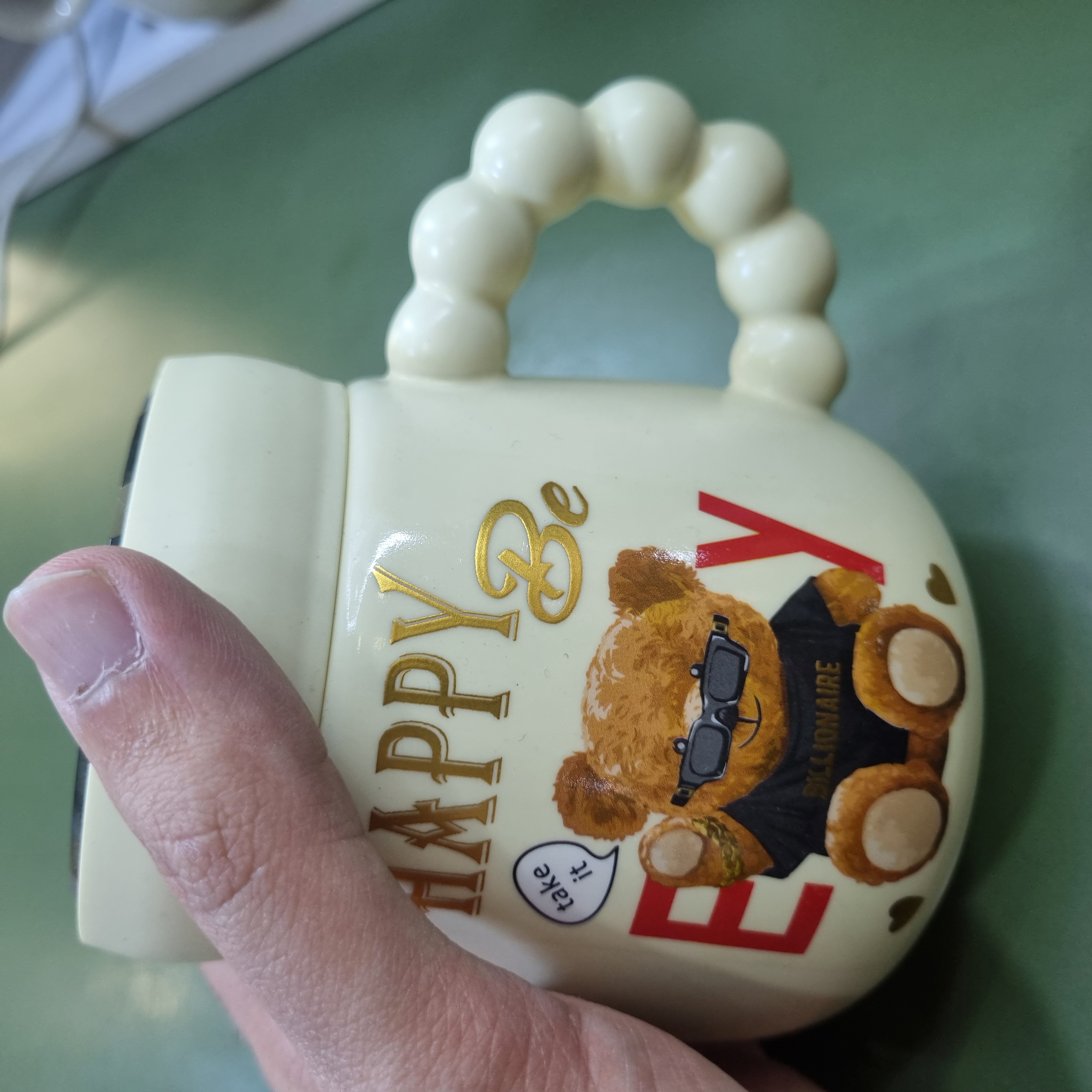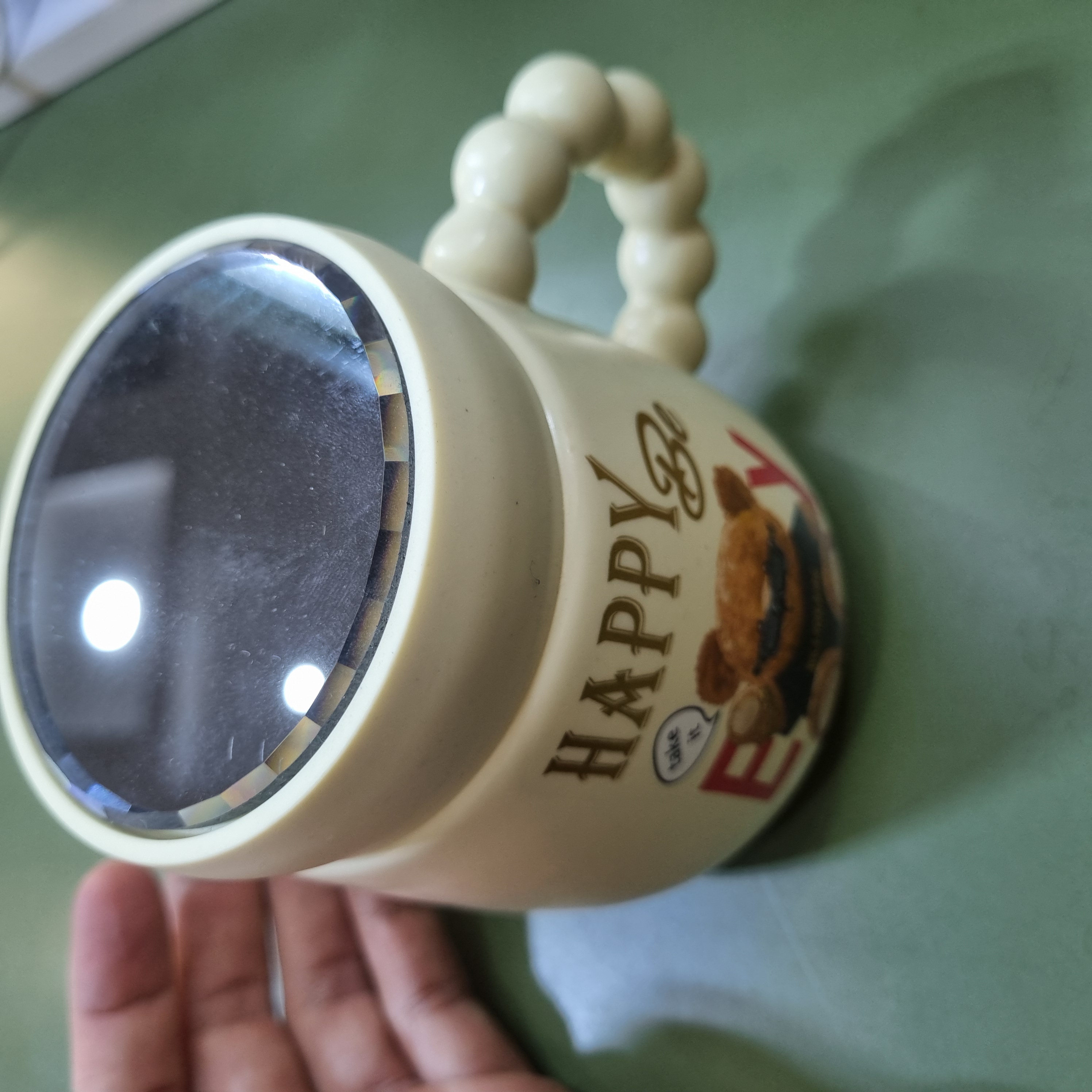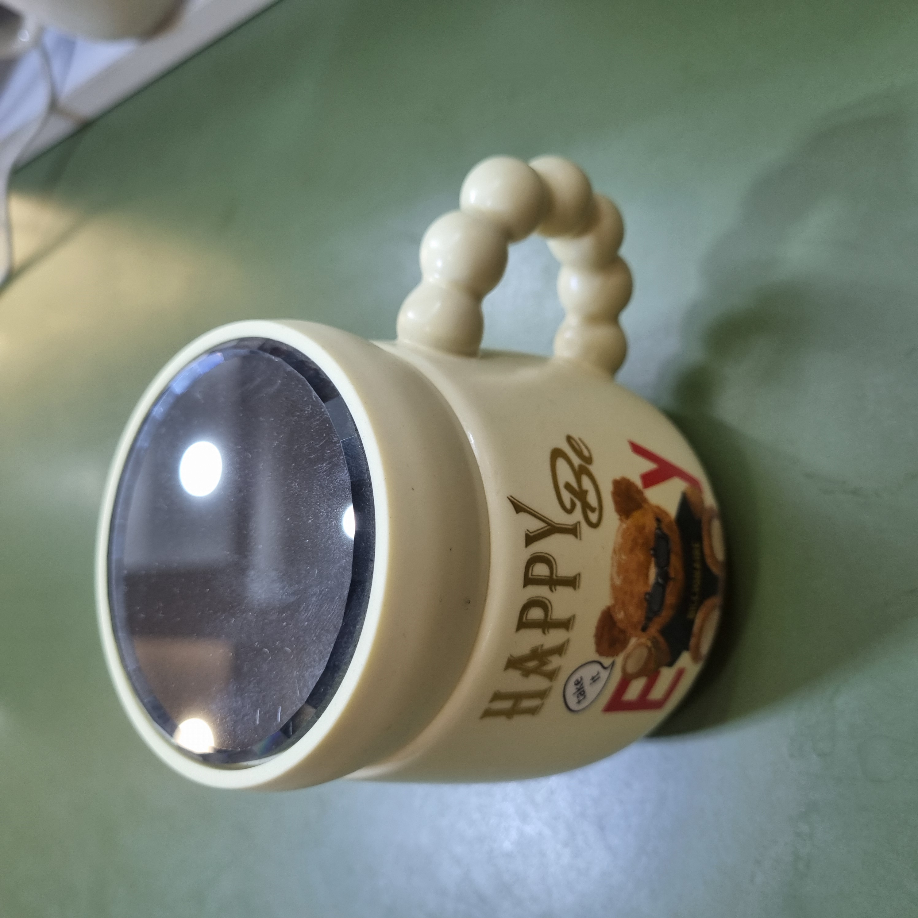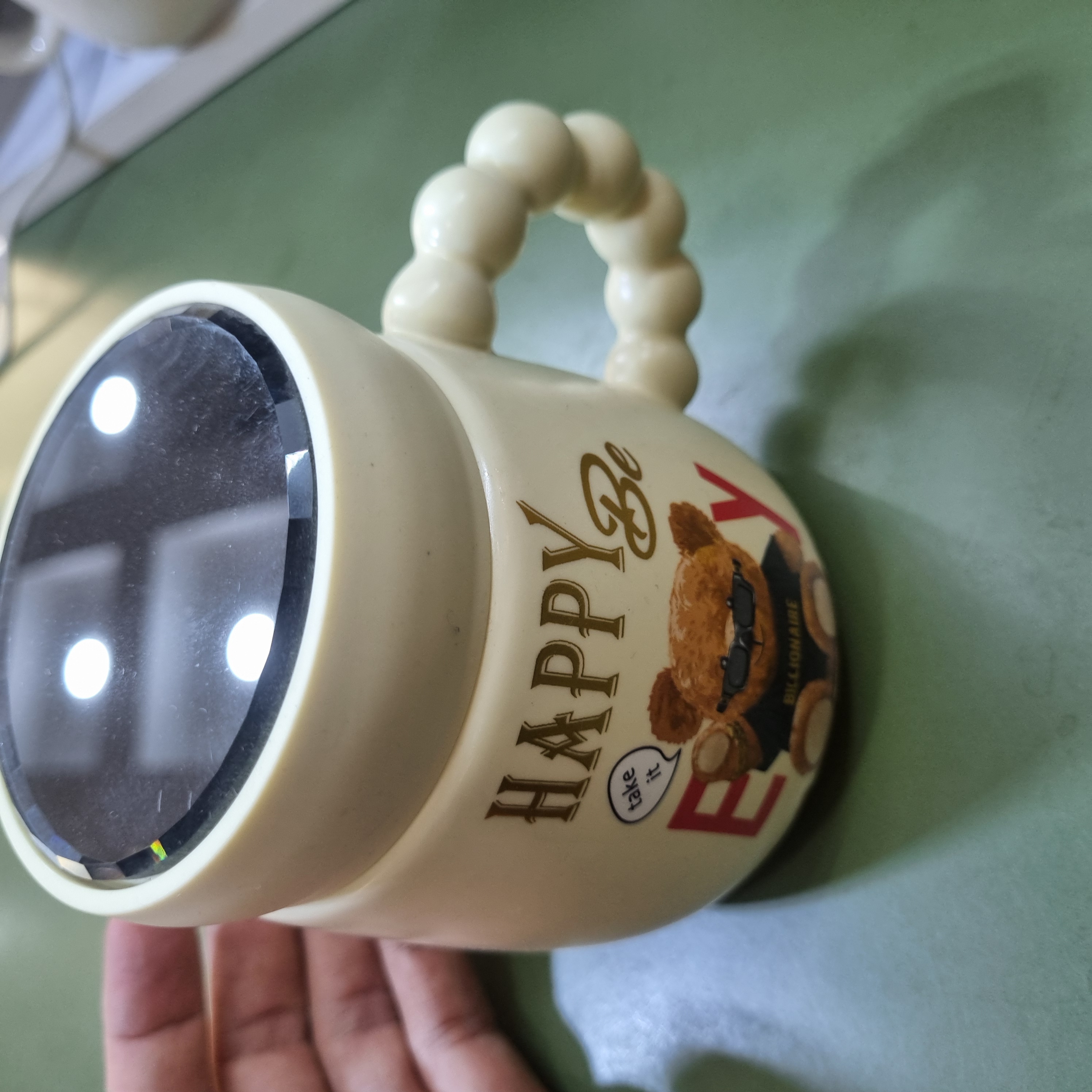 جنس چینی وارداتی، دارای درب آینهای، طرح خرس فانتزی با نوشته Happy Be Every Day، مناسب نوشیدنی گرم و سرد، ابعاد حدود ۱۰×۸ سانتیمتر، کد محصول CN1030.
