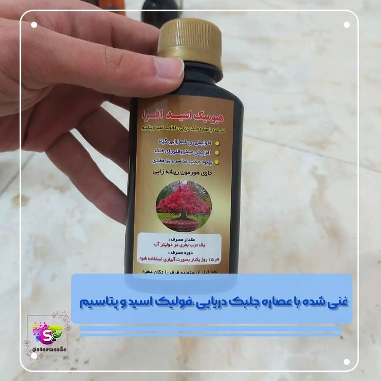هیومیک اسید غنی شده ارجینال غنی شده با عصاره جلبک دریایی فولیک اسید و پتاسیم افزایش ریشه زایی گیاه افزایش میکروفلورای خاک بهبود جذب عناصر ریز مغذی حاوی هورمون ریشه زایی توجه کنید : نمونه های فیک با بسته بندی خونگی به وفور در بازار یافت میشه لطفا مراقب سلامت گل و گیاهانتون باشید __________________ چرا " استارماشو " ؟ * دارای سایت و نماد اعتماد الکترونیک(اینماد) ● کافیست در اینترنت و فضای مجازی نامِ " استارماشو " را به فارسی یا انگلیسی " starmasho " جستجو کنید.